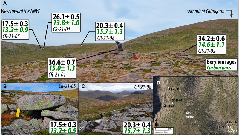 Here, we use paired 10Be and 14C exposure dating on quartz derived from glacial erratics and bedrock to resolve past ice mass fluctuations across an elevation and geomorphic gradient in the Cairngorm Mountains of Scotland. We find that the highest elevation samples in our dataset, at 1140m above sea level, yield 10Be ages indicating 23 000 years of exposure and are at secular equilibrium for 14C, indicative of a single period of exposure starting as a nunatak during the Last Glacial Maximum. Other samples from above 1000m elevation produce 14C exposure ages indicating deglaciation during the Bølling–Allerød Interstadial, while 10Be concentrations display varying levels of inheritance due to local variations in glacial and non‐glacial erosion. Samples from lower elevations indicate a Lateglacial moraine building event 15 000 years ago, coincident with the Wester Ross readvance, followed by a period of glacier retreat interrupted by moraine deposition at ~14 000 and ~11 000 years ago. This dataset reconstructs both thinning and marginal recession of paleo‐ice masses within the Cairngorm Mountains across a >600m vertical gradient during the most recent glacial–interglacial transition, demonstrating the utility of paired 10Be/14C exposure dating in ice mass reconstructions in areas of low glacial erosion, increasing the geomorphic diversity of chronologic data available for glacial reconstructions.